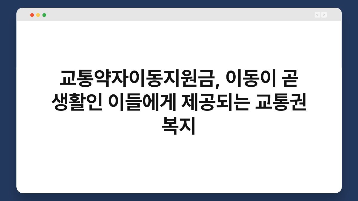 교통약자이동지원금은 이동이 어려운 이들에게 제공되는 중요한 복지 정책입니다. 이 지원금은 교통약자, 즉 장애인이나 노인, 임산부 등 이동에 제약이 있는 사람들에게 교통비를 지원하여 그들의 일상생활을 돕습니다. 이동이 곧 생활인 이들에게는 이러한 지원이 큰 도움이 되며, 그들의 사회적 참여를 확대하는 데 기여합니다. 제 주변에서도 교통약자이동지원금 덕분에 이동이 한결 수월해진 친구를 보며, 이 정책의 필요성을 더욱 느꼈습니다. 이 글을 통해 교통약자이동지원금의 의미와 필요성, 그리고 실제 사례를 알아보며, 이 정책이 어떻게 우리의 삶에 긍정적인 영향을 미치는지 살펴보겠습니다.