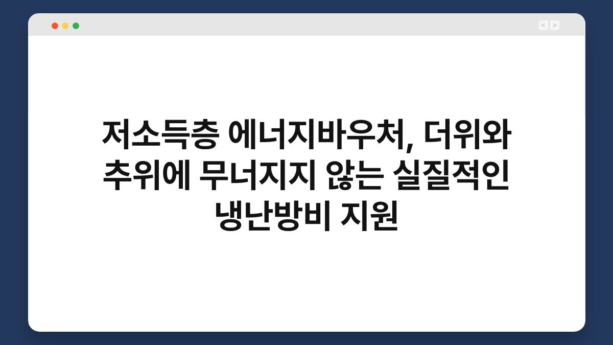 저소득층 에너지바우처는 저소득층 가구를 대상으로 한 에너지 비용 지원 프로그램입니다. 이 제도는 특히 더위와 추위에 무너지지 않도록 실질적인 냉난방비를 지원하여, 에너지 비용 부담을 덜어주기 위해 마련되었습니다. 많은 이들이 경제적 어려움 속에서 에너지 비용을 감당하기 힘들어하는 상황에서, 에너지바우처는 큰 도움이 될 수 있습니다. 저 또한 이러한 지원이 절실했던 시기가 있었기에, 그 필요성을 깊이 이해하고 있습니다. 이 글을 통해 저소득층 에너지바우처의 의미와 중요성, 그리고 신청 방법 등 다양한 정보를 알게 되실 것입니다.