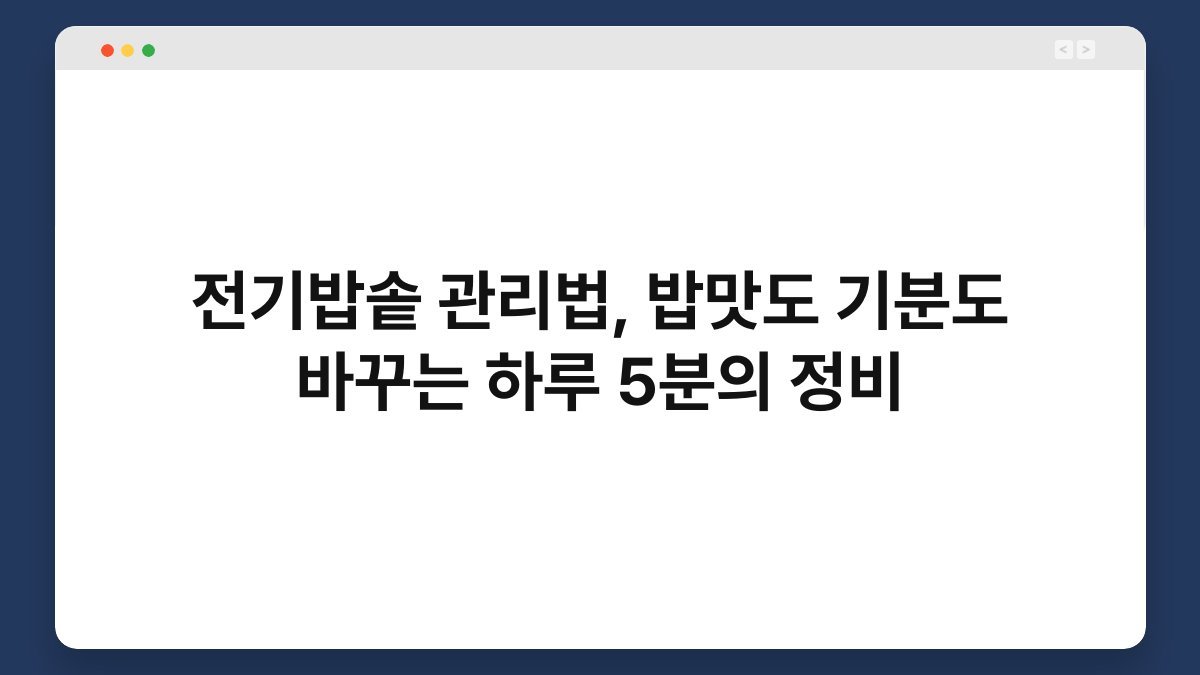 전기밥솥 관리법은 밥을 맛있게 짓기 위한 필수 요소입니다. 많은 가정에서 전기밥솥은 매일 사용되지만, 제대로 관리하지 않으면 밥맛이 떨어질 수 있습니다. 저도 처음에는 간단한 청소만으로 충분하다고 생각했지만, 시간이 지남에 따라 밥맛이 변하는 것을 느꼈습니다. 하루에 단 5분만 투자하면 밥맛도 기분도 바꿀 수 있다는 사실을 알게 되었습니다. 이 글을 통해 전기밥솥 관리법을 익히고, 맛있는 밥을 짓기 위한 정비 방법을 알아보실 수 있습니다.
