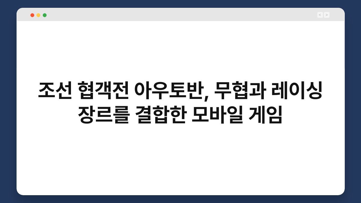 조선 협객전 아우토반은 무협과 레이싱 장르를 결합한 모바일 게임으로, 독특한 매력을 지니고 있습니다. 이 게임은 전통적인 무협의 멋과 스피드를 자랑하는 레이싱의 긴장감을 동시에 제공합니다. 게임을 하면서 느끼는 쾌감은 마치 영화 속 주인공이 되어 액션을 펼치는 듯한 기분을 선사합니다. 저 또한 이 게임을 통해 빠른 속도와 화려한 전투를 경험하며, 그 매력에 흠뻑 빠져들었습니다. 이 글을 읽으시면 조선 협객전 아우토반의 세계와 그 특징, 그리고 게임을 더욱 즐길 수 있는 팁을 알게 되실 것입니다.