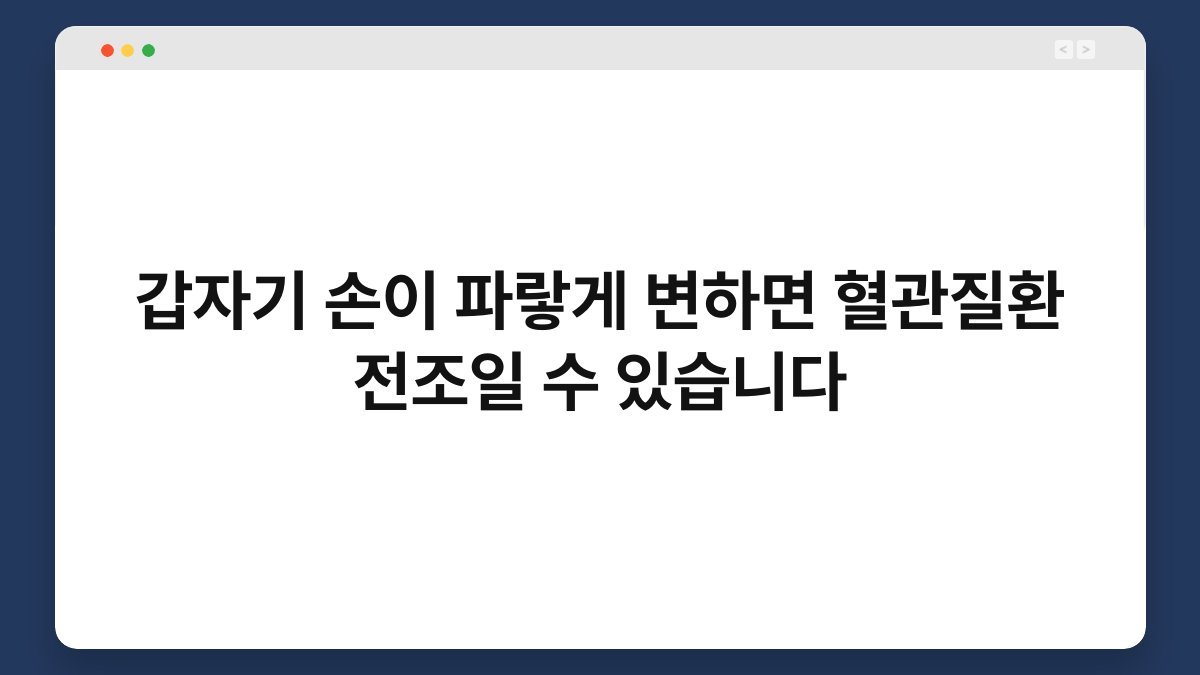 갑자기 손이 파랗게 변하면 혈관질환 전조일 수 있습니다. 손의 색깔이 갑자기 변하는 경험은 많은 사람들에게 생소할 수 있습니다. 이러한 변화는 단순히 추위나 스트레스 때문일 수도 있지만, 때로는 심각한 혈관질환의 신호일 수 있습니다. 저도 일상에서 손이 파랗게 변하는 경험을 한 적이 있어, 그때의 불안감이 지금도 생생합니다. 이 글을 통해 손의 색깔 변화가 의미하는 바와 혈관질환의 전조 증상에 대해 알아보겠습니다. 또한, 이러한 증상이 나타날 때 어떻게 대처해야 하는지도 살펴보겠습니다.