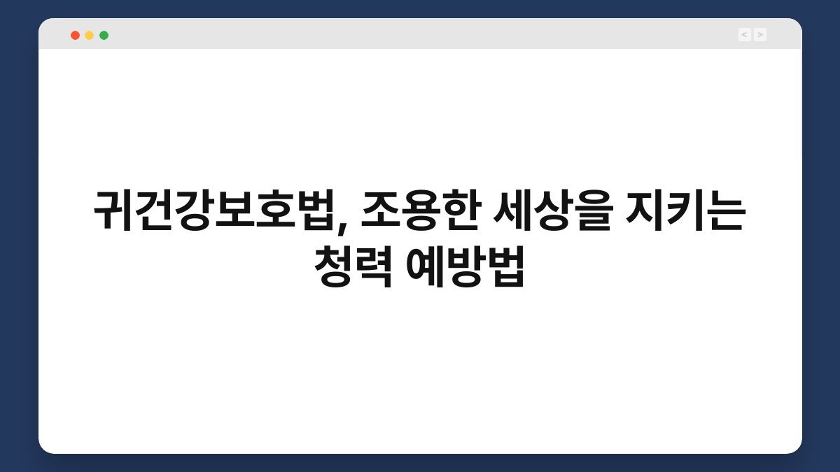 귀건강보호법은 우리의 소중한 청력을 지키기 위한 법률로, 소음으로부터 귀를 보호하고 청력 손실을 예방하는 다양한 조치를 포함하고 있습니다. 현대 사회에서 우리는 다양한 소음에 노출되어 있으며, 이로 인해 청력 문제가 발생할 수 있습니다. 저 또한 고음질 음악을 좋아해 이어폰을 자주 사용했는데, 그로 인해 청력에 문제가 생길 뻔한 경험이 있습니다. 이러한 경험을 통해 귀 건강의 중요성을 깨달았고, 귀건강보호법이 얼마나 필요한지 실감하게 되었습니다. 이 글을 통해 귀 건강을 지키는 방법과 조용한 세상을 만드는 청력 예방법에 대해 알아보겠습니다.