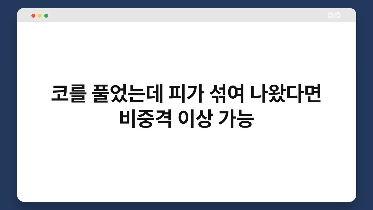코를 풀었는데 피가 섞여 나왔다면 비중격 이상 가능성에 대해 많은 사람들이 궁금해합니다. 특히, 일상에서 코를 풀다 보면 가끔 피가 보일 수 있는데, 이는 여러 원인으로 인해 발생할 수 있습니다. 저도 한 번은 감기 때문에 코를 풀었는데, 피가 섞여 나와 깜짝 놀란 경험이 있습니다. 이런 상황에서 불안한 마음이 드는 것은 당연한 일입니다. 이 글을 통해 코에서 피가 나오는 이유와 비중격 이상 가능성에 대해 알아보고, 어떻게 대처해야 하는지에 대해 설명드리겠습니다.
